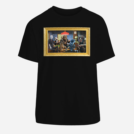 Cryptids Playing Poker T-Shirt | Bigfoot Loch Ness Monster Art Parody | Mythical Creatures Black Cotton Tee